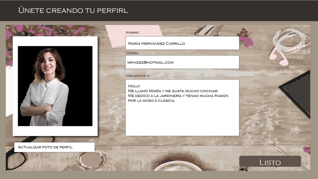 Pantalla de cómo se vería al crear tu perfil/cuenta los datos que se te pedirán (pocos) y algún contacto