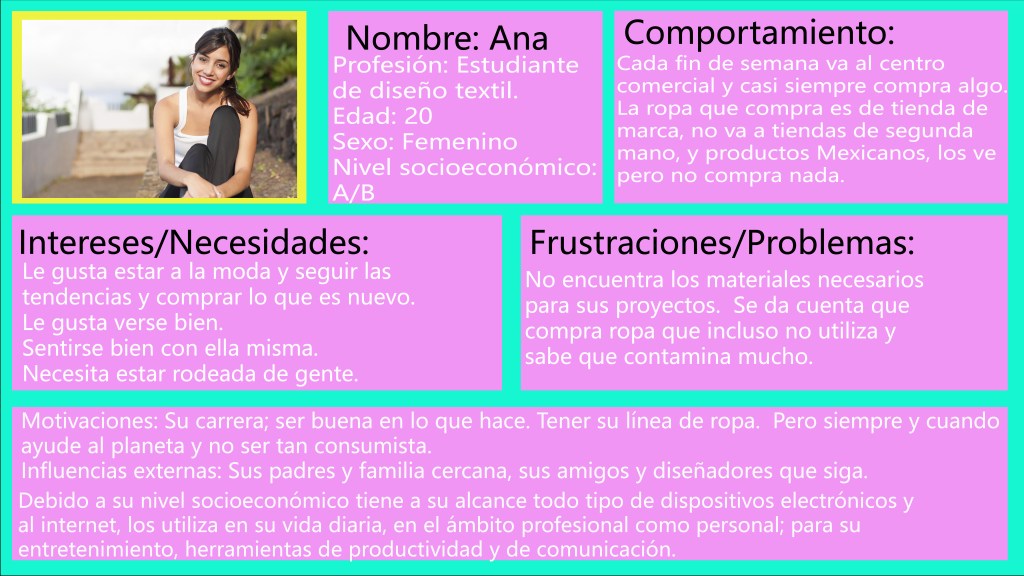 Áreas de oportunidad: Hacer una tienda física de ropa de segunda mano que tenga cierto sistema de organización /tienda digital donde la gente escriba algo sobre ellos y así crear cierta conexión.