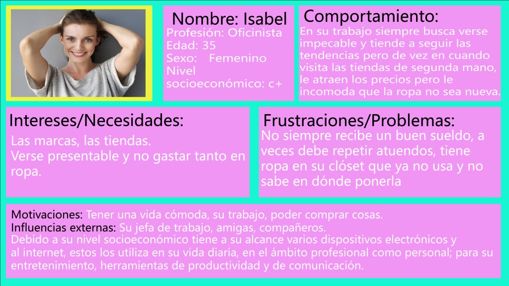 Solución: Isabel encuentra la parte de descripción acerca de una blusa que le gustó, nota el nombre de la persona que la usó y se siente mejor porque nota que tienen el mismo gusto en ropa. Ella se siente atraída por el precio que es accesible a diferencia de las tiendas a las que normalmente suele comprar. Ella termina ayudando a la tienda donando su ropa que ya no le queda porque puede ayudar a alguien más que se encuentra en esa situación.