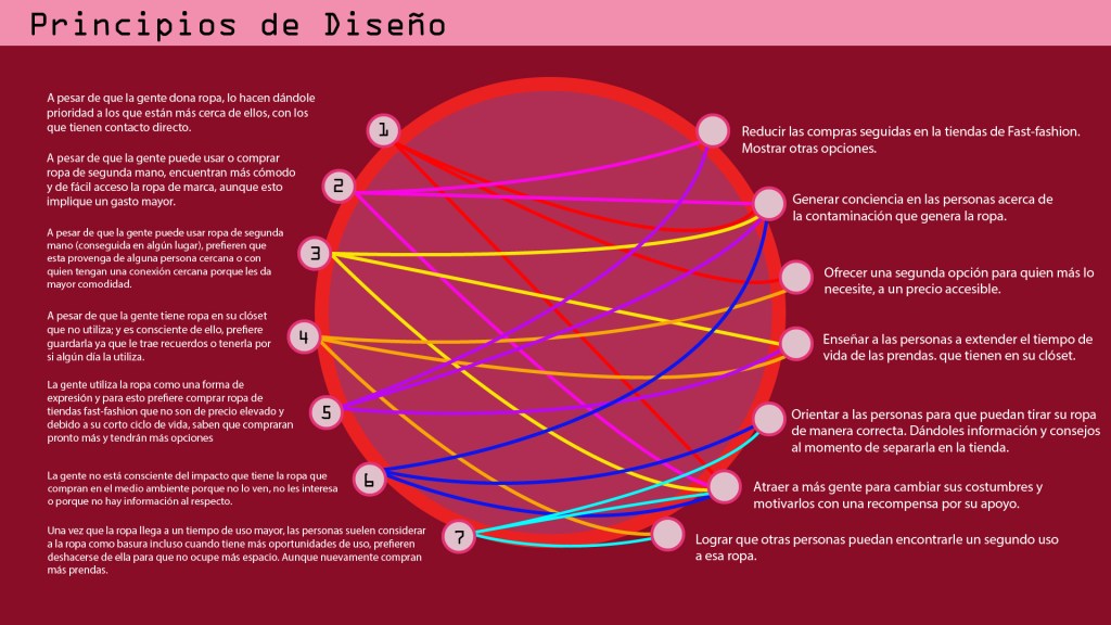 Principio de diseño 1: Se ofrecen distintas opciones de ropa, los precios serían más bajos pero es ropa usada por lo que habría información positiva con respecto a la ropa que adquieren en nuestra tienda. «Por cada pantalón que compres, se ahorran 10,000 litros de agua» para poder generar conciencia e interés en las personas.